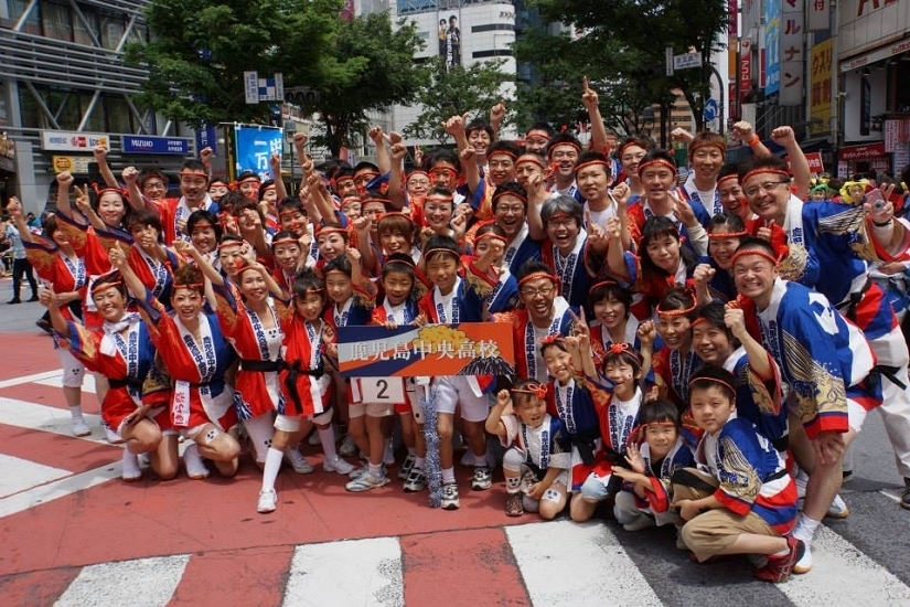 鹿児島連9連の合計66連、約2600人の踊り手により元気な渋谷の 道玄坂
